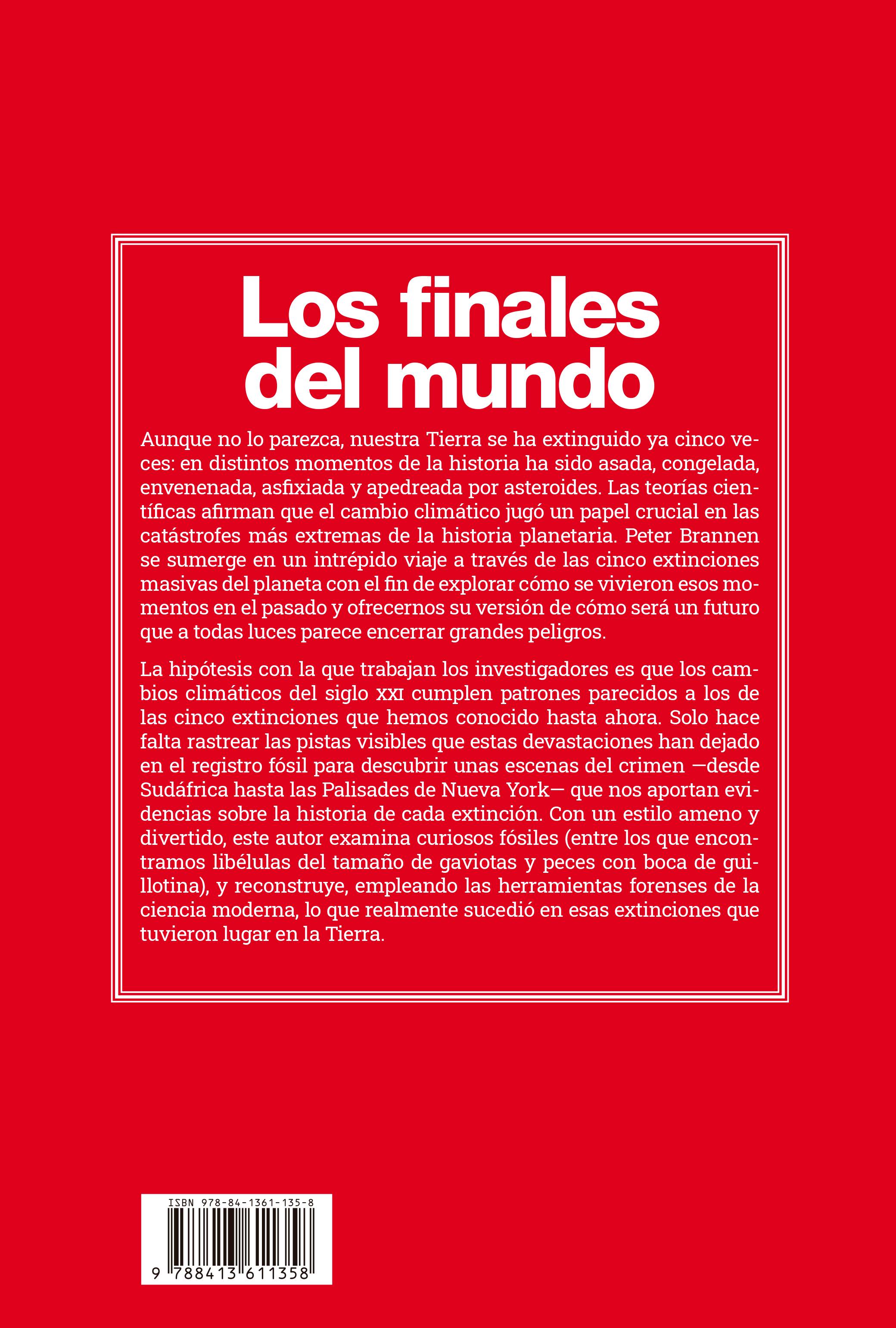 Aunque no lo parezca, nuestra Tierra se ha extinguido ya cinco veces: ha sido asada, congelada, envenenada, asfixiada y apedreada por asteroides. La ciencia sugiere que el cambio climático jugó un papel crucial en las catástrofes más extremas de la historia del planeta. Peter Brannen se sumerge en un intrépido viaje a través de las cinco extinciones masivas del planeta para explorar cómo han sido esos callejones sin salida de su pasado y al mismo tiempo, ofrecernos un atisbo de nuestro futuro, un futuro cada vez más peligroso.