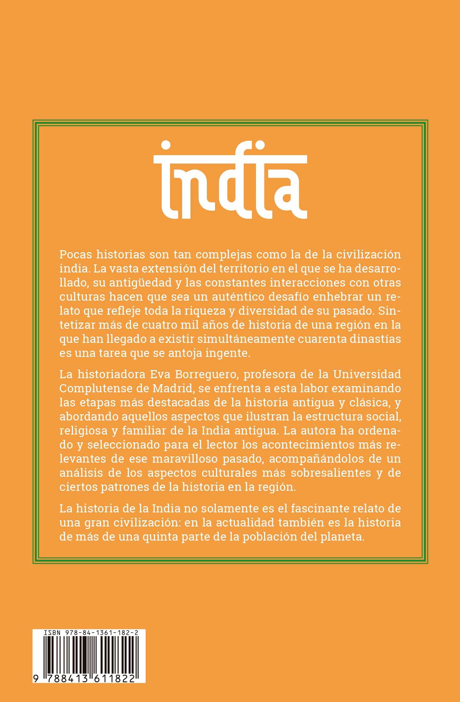 Ese es precisamente el reto que se ha propuesto superar en este libro la historiadora Eva Borreguero, profesora de la Universidad Complutense de Madrid. En él, se examinan las etapas más destacadas de la historia antigua y clásica, y se abordan aquellos aspectos que ilustran la estructura social, religiosa y familiar de la India. La autora ha ordenado y seleccionado para el lector los acontecimientos más relevantes de ese maravilloso pasado, acompañándolos de un análisis de los aspectos culturales más sobresalientes y de ciertos patrones de la historia en la región.