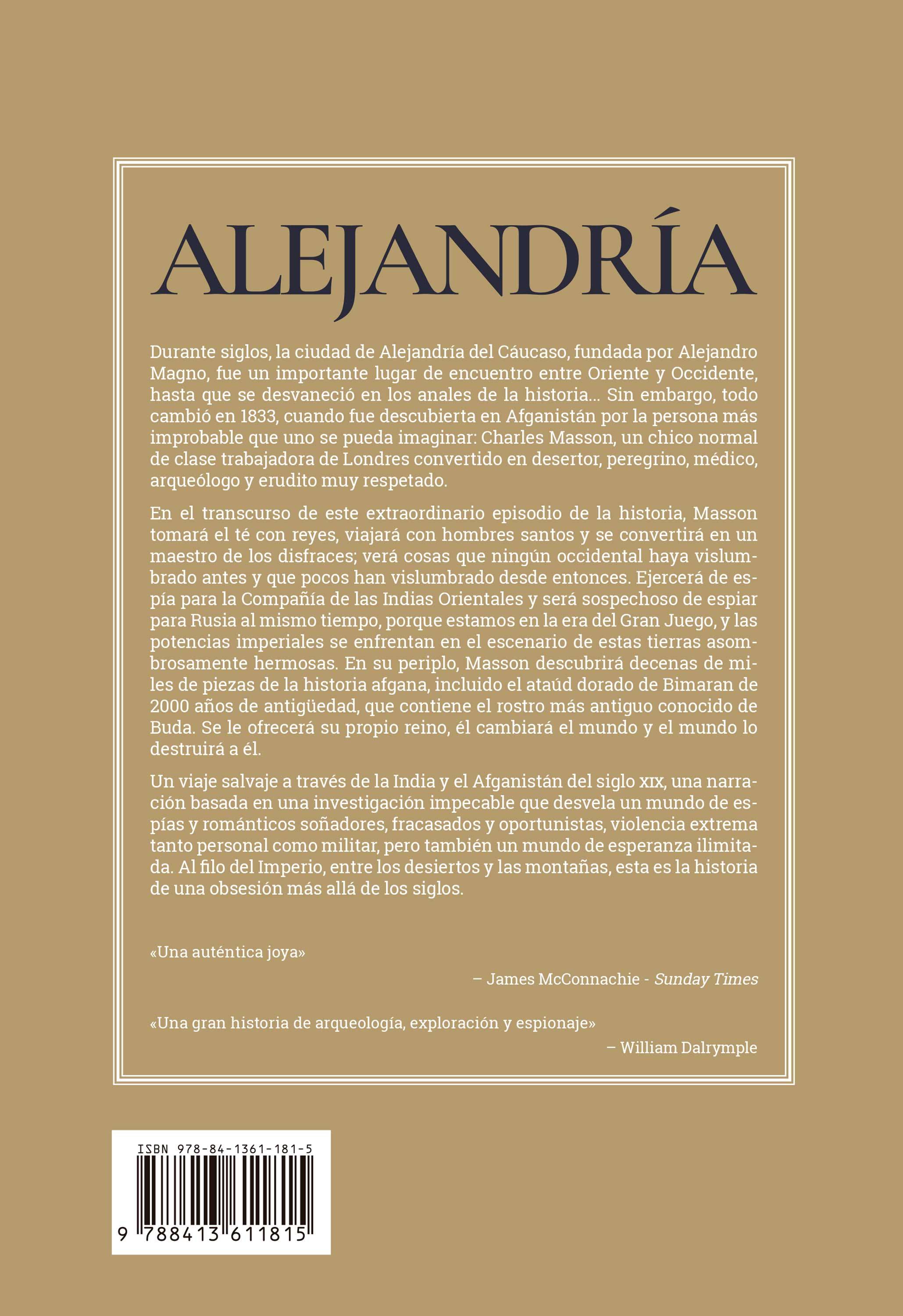 Durante siglos, la ciudad de Alejandría del Cáucaso, fundada por Alejandro Magno, fue un importante lugar de encuentro entre Oriente y Occidente, hasta que se desvaneció en los anales de la historia... Sin embargo, todo cambió en 1833, cuando fue descubierta en Afganistán por la persona más improbable que uno se pueda imaginar: Charles Masson, un chico normal de clase trabajadora de Londres convertido en desertor, peregrino, médico, arqueólogo y erudito muy respetado.