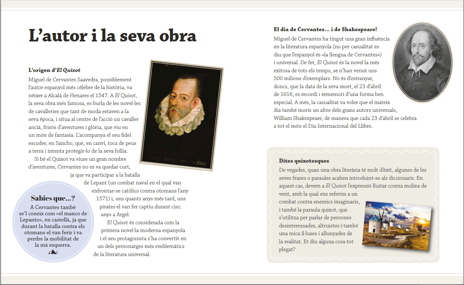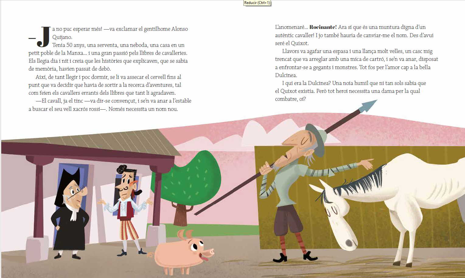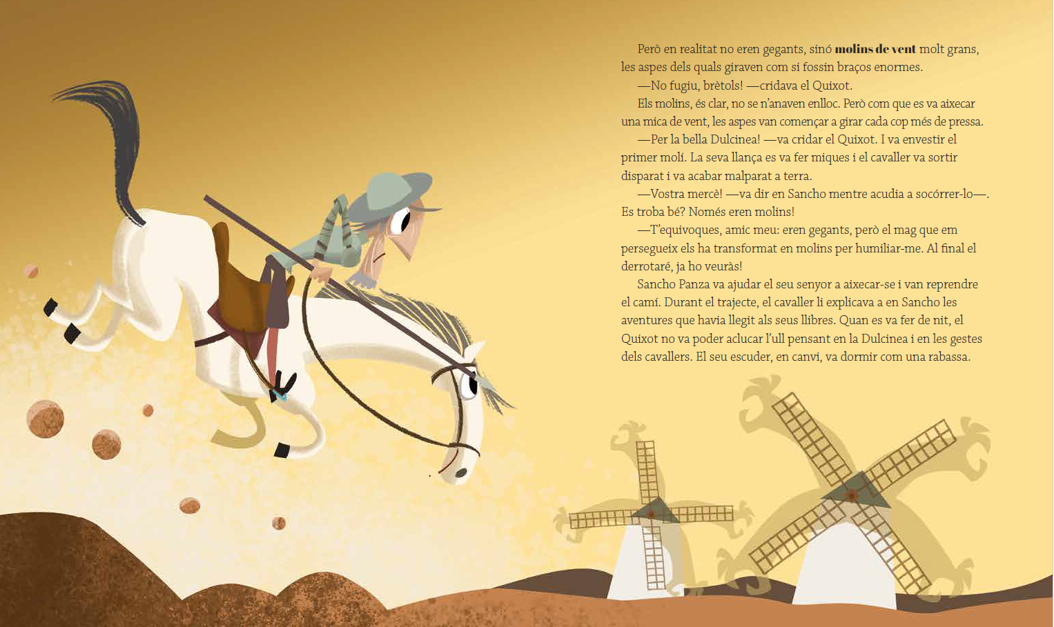 En un lloc de la Manxa, el nom del qual no volem recordar, viu el Quixot, l’enginyós gentilhome a qui res li agrada més que llegir novel·les de cavalleries. N’està tan fascinat que, un dia, decideix convertir-se en cavaller i sortir a buscar aventures, com si fos un personatge més d’aquelles novel·les. L’acompanyarà el seu fidel amic i escuder Sancho Panza, amb el que viurà una infinitat de peripècies d’allò més divertides.