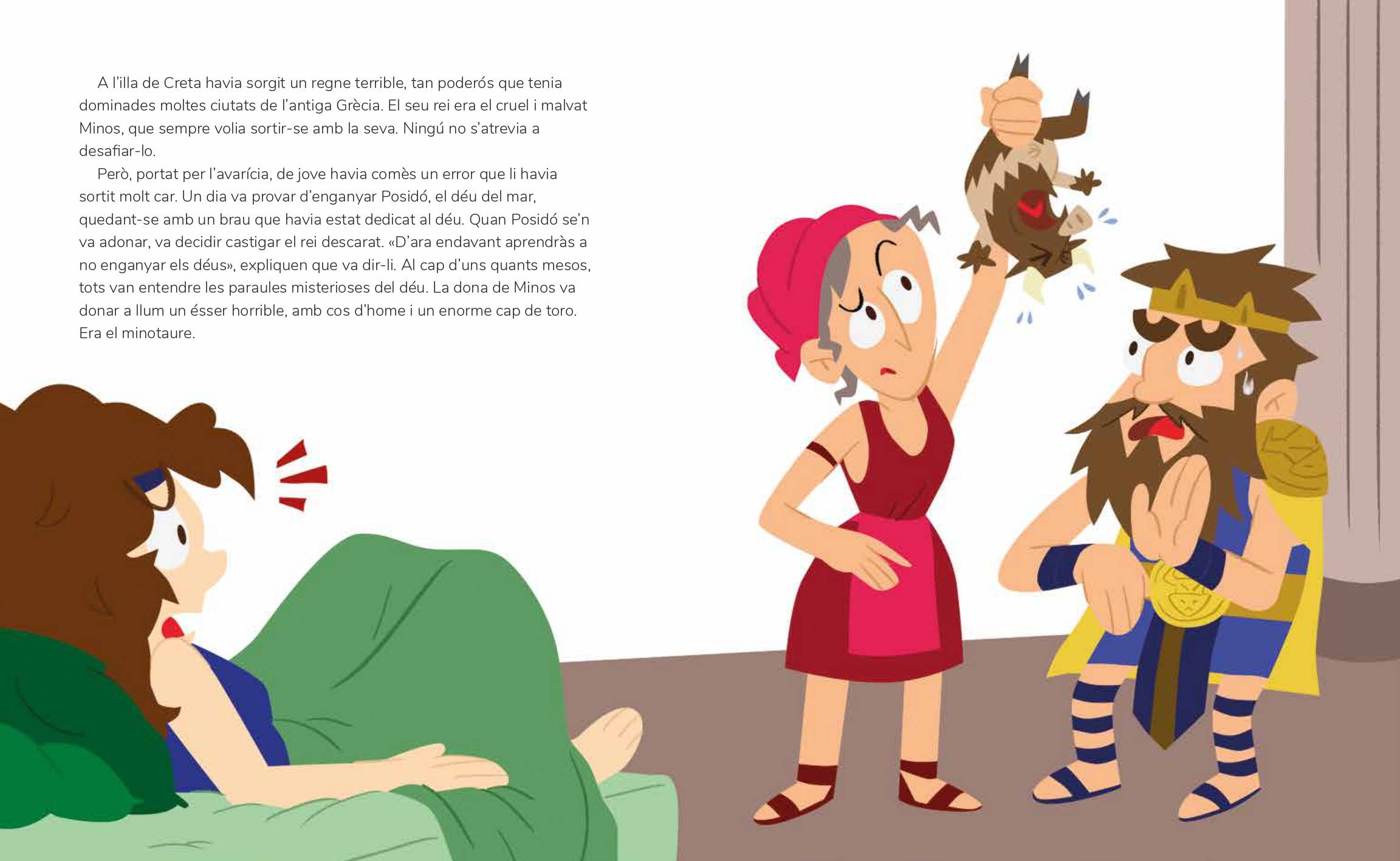 Fa molt i molt de temps, en aquella època de la qual ens parlen els mites, a la Terra hi vivia un monstre lleig i temible com cap altre: el minotaure. Era un animal ferotge, meitat home i meitat brau, que s’alimentava de carn humana. El seu menjar preferit eren els catorze nois i noies ateneus que li entregaven cada any a les portes del laberint on el tenien tancat. Quina por! Ningú volia ser presa d’un monstre tan horrorós! Hi hauria algun heroi sobre la Terra capaç d’alliberar-los de la terrible amenaça?