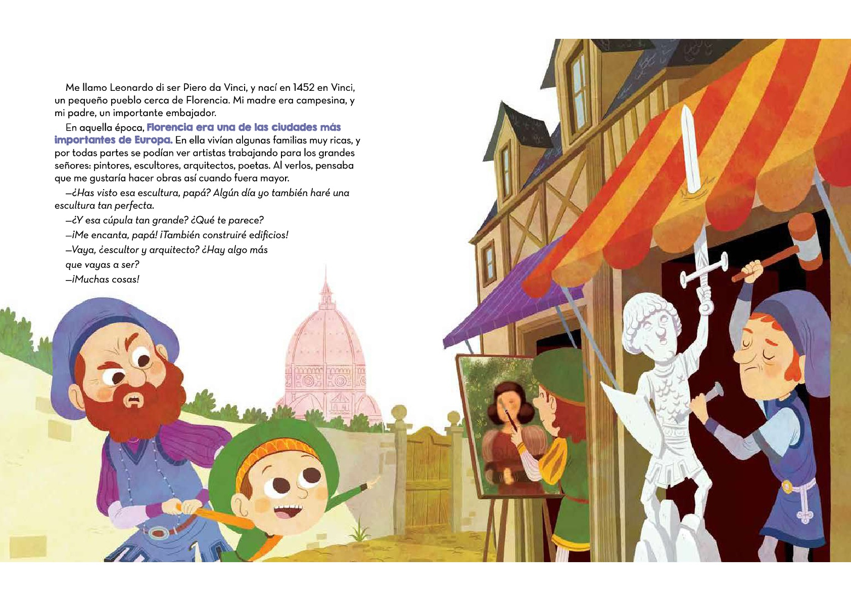 Cuando era pequeño y le preguntaban qué quería ser de mayor no sabía qué responder, porque le interesaba todo. La mayoría de la gente lo conoce como pintor, aunque en realidad también fue inventor, científico, ingeniero, arquitecto, filósofo, escritor… Pero lo importante no es solo que hiciese muchas cosas diferentes, sino que siempre intentó hacerlas de una manera que nunca nadie hubiera probado antes, y así, convertir en realidad todo cuanto imaginó. Sus ideas fueron tan visionarias que muchos de sus inventos acabaron por hacerse realidad siglos más tarde.