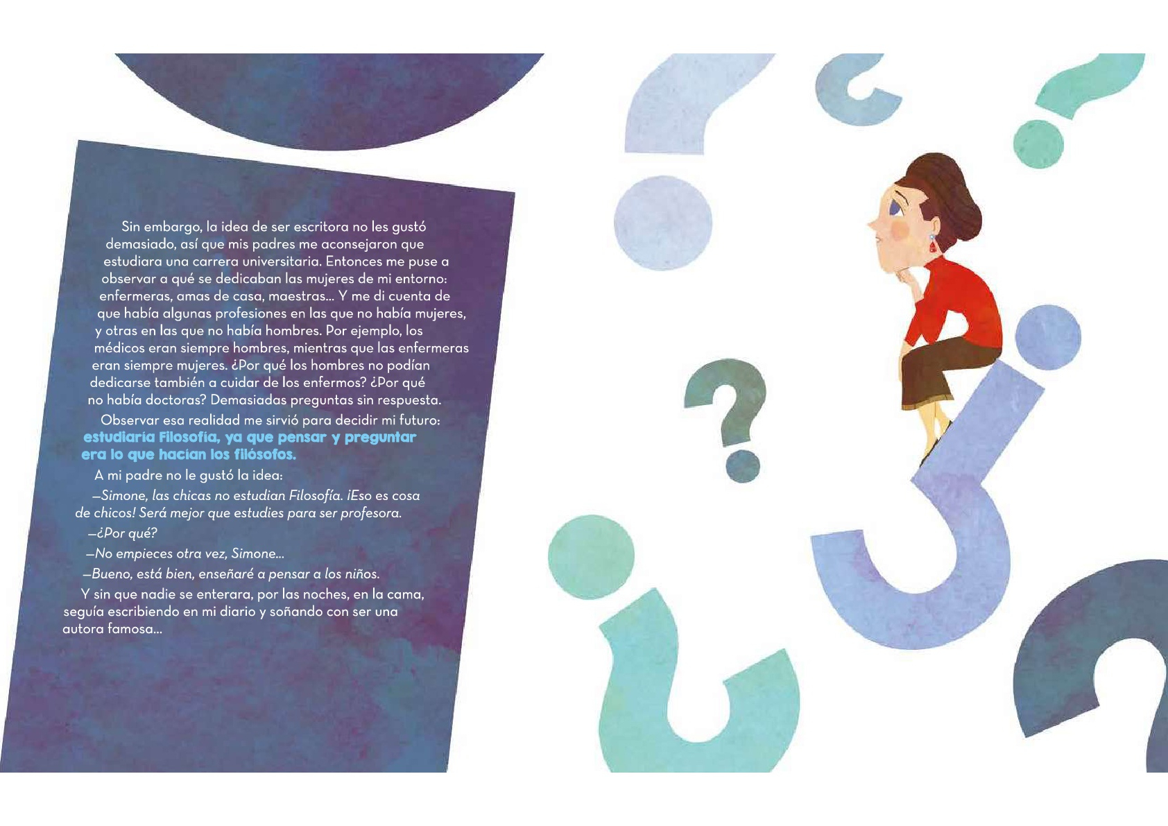 ¿Alguna vez te has parado a pensar por qué a las niñas les regalan muñecas para jugar y a los niños no? ¿Y por qué se viste a los bebés de rosa si son niñas y de azul si son niños? ¿Qué pasaría si hiciéramos lo contrario? Simone de Beauvoir dedicó toda su vida a reflexionar y escribir sobre las diferencias entre mujeres y hombres y llegó a la conclusión de que no tienen ningún sentido. Aunque muchos estaban convencidos de que las mujeres eran menos listas, más débiles y más miedosas que los hombres, y que por eso no eran capaces de hacer las mismas cosas que ellos, esas diferencias en realidad no existen. Simone de Beauvoir fue considerada una de las filósofas más importantes del siglo xx por haber defendido la igualdad entre hombres y mujeres.