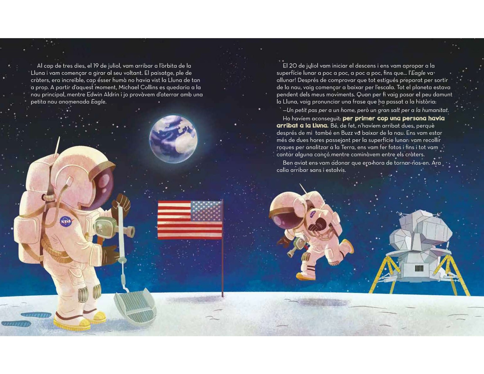 A Neil Armstrong sempre li van agradar els avions i les exploracions estel·lars. Per això, quan per primera vegada a la història van voler enviar una nau pilotada per homes a la Lluna, es va apuntar per ser un dels pilots sense dubtar-ho. I el van agafar! Amb els seus amics i companys Buzz i Collins, van pujar a l’Apollo 11 en direcció a la Lluna, i amb el vestit d’astronauta posat, Armstrong es va convertir en el primer home de la Terra que posava un peu a la superfície lunar.
