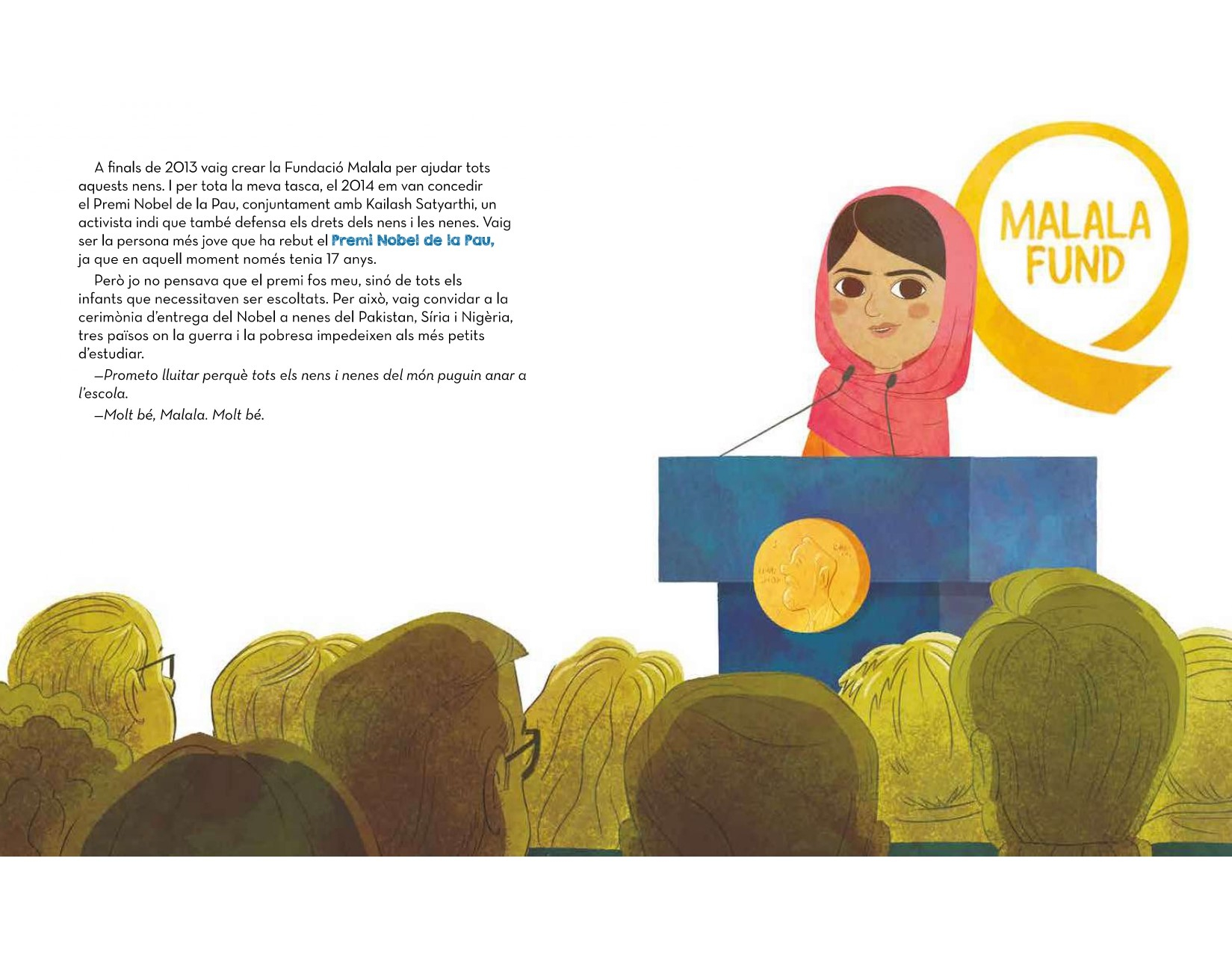 Quan Malala tenia 15 anys, un taliban va disparar-li al cap pel fet de ser nena i anar a l’escola. Els talibans s’havien fet amb el poder a la vall on ella vivia posant bombes i obligant a la gent a complir amb unes normes totalment injustes. Tot i les ferides, Malala va voler lluitar pels seus drets i pels de tots els nens del món, motiu que la va portar a rebre el Premi Nobel de la Pau amb tan sols 17 anys.