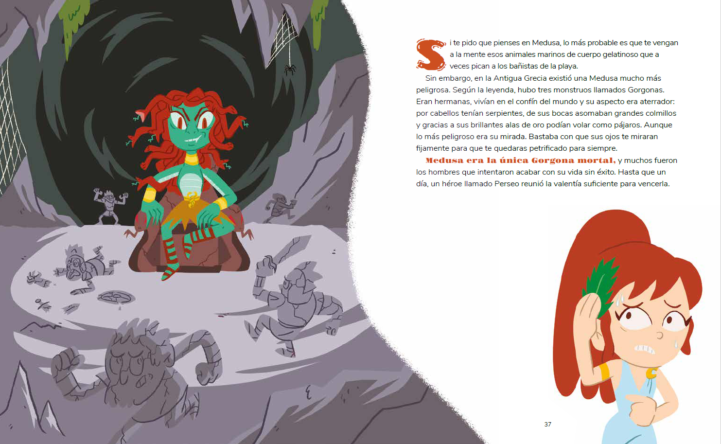 En el mágico de los mitos, habitaban en la tierra unos monstruos espeluznantes a los que nadie osaba desafiar. Medusa tenía serpientes en vez de cabellos, el Minotauro tenía medio cuerpo de toro y medio cuerpo con forma de hombre, y la Esfinge, ese bicho raro con forma de ave y de mujer a la vez, era capaz de devorar a todo aquel que no supiera acertar unos acertijos muy difíciles. Por suerte, a cada uno de ellos le llegó un momento decisivo, el momento en el que los héroes más valientes de toda Grecia se enfrentaron a ellos. Fueron Teseo, Perseo y Edipo, y en este libro encontrarás cada una de sus proezas.