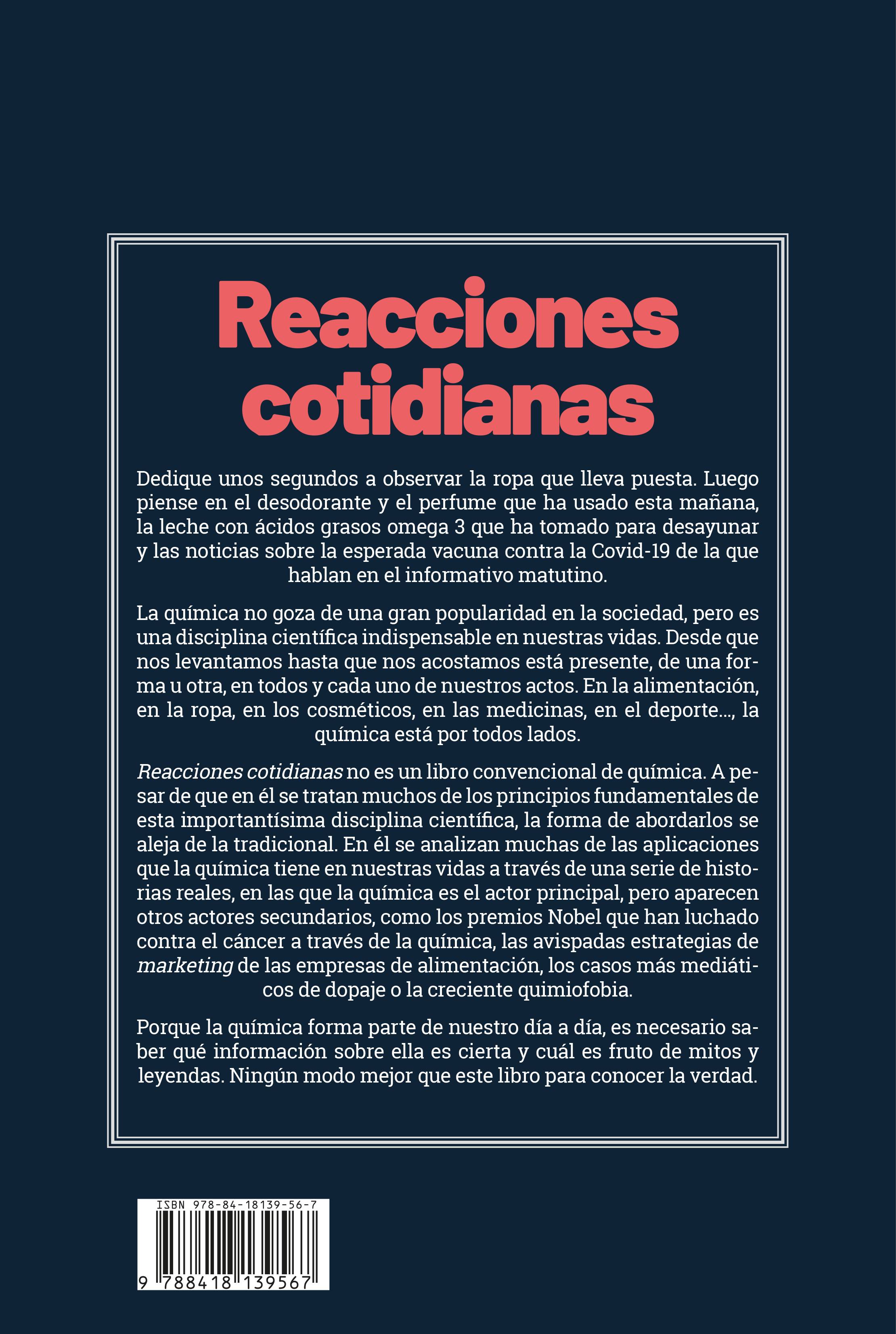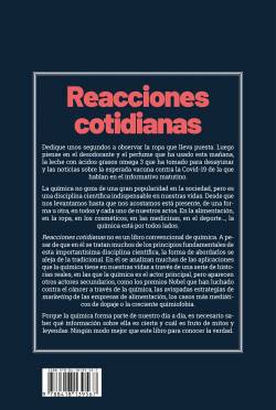 Desde que nos levantamos hasta que nos acostamos, la química está presente, de una forma u otra, en todos y cada uno de nuestros actos. Reacciones cotidianas no es un libro convencional de química. A pesar de que en él se tratan muchos de los principios fundamentales de esta importantísima disciplina científica, la forma de abordarlos se aleja de la tradicional. En él se analizan muchas de las aplicaciones que la química tiene en nuestras vidas a través de una serie de historias reales: las de los premios Nobel que han luchado contra el cáncer, las avispadas estrategias de marketing de las empresas de alimentación, los casos más mediáticos de dopaje o la creciente quimiofobia. Porque la química forma parte de nuestro día a día, es necesario saber qué información sobre ella es cierta y cuál es fruto de mitos y leyendas. Ningún modo mejor que este libro para conocer la verdad.