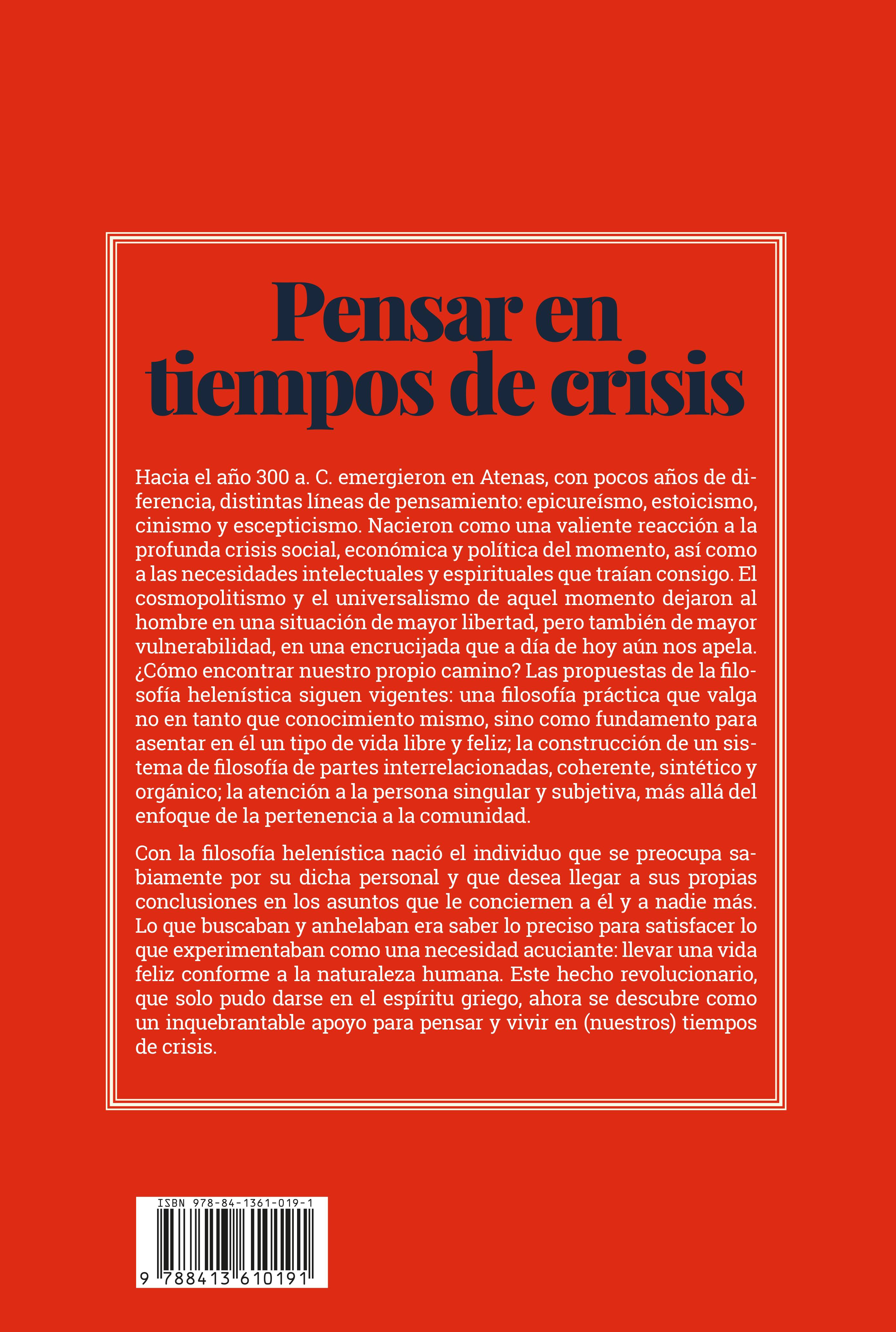 Hacia el año 300 a. C. emergieron en Atenas, con pocos años de diferencia, distintas líneas de pensamiento: epicureísmo, estoicismo, cinismo y escepticismo. Nacieron como una valiente reacción a la profunda crisis social, económica y política del momento, así como a las necesidades intelectuales y espirituales que traían consigo. El cosmopolitismo y el universalismo de aquel momento dejaron al hombre en una situación de mayor libertad, pero también de mayor vulnerabilidad, en una encrucijada que a día de hoy aún nos apela. ¿Cómo encontrar nuestro propio camino? Las propuestas de la filosofía helenística siguen vigentes: una filosofía práctica que valga no en tanto que conocimiento mismo, sino como fundamento para asentar en él un tipo de vida libre y feliz; la construcción de un sistema de filosofía de partes interrelacionadas, coherente, sintético y orgánico; la atención a la persona singular y subjetiva, más allá del enfoque de la pertenencia a la comunidad.