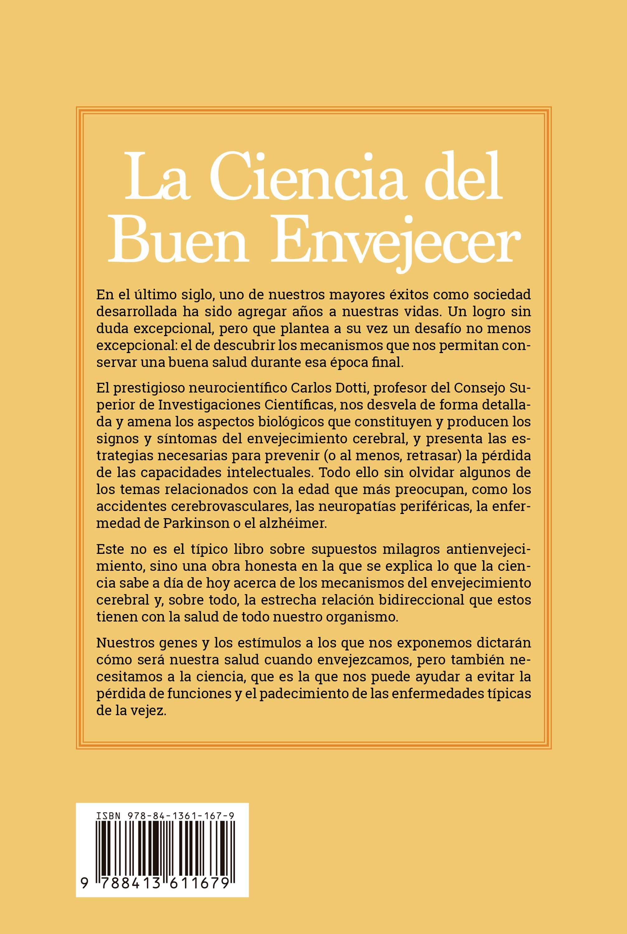 El prestigioso neurocientífico Carlos Dotti, profesor del Consejo Superior de Investigaciones Científicas, nos desvela de forma detallada y amena los aspectos biológicos que constituyen y producen los signos y síntomas del envejecimiento cerebral, y presenta las estrategias necesarias para prevenir (o al menos, retrasar) la pérdida de las capacidades intelectuales. Todo ello sin olvidar algunos de los temas relacionados con la edad que más preocupan, como los accidentes cerebrovasculares, las neuropatías periféricas, la enfermedad de Parkinson o el Alzheimer.