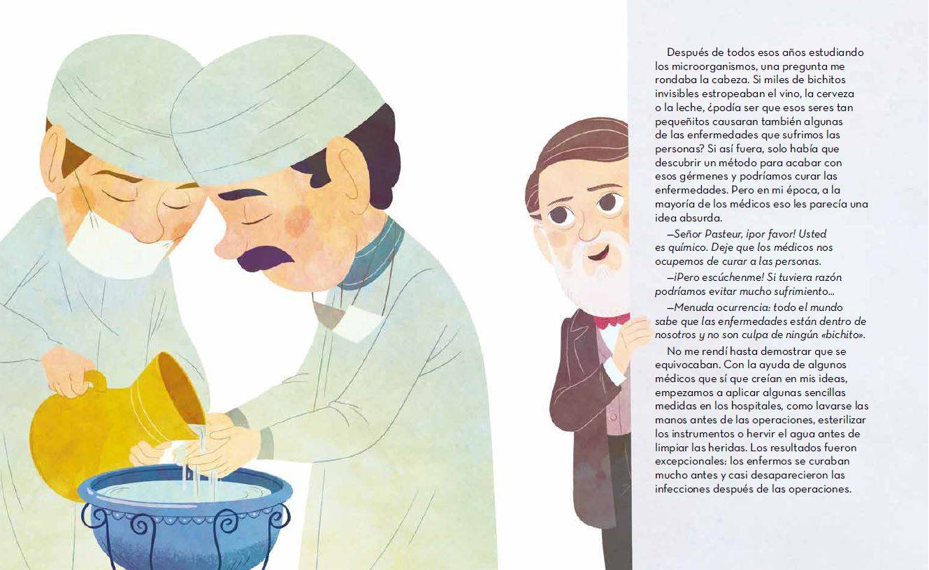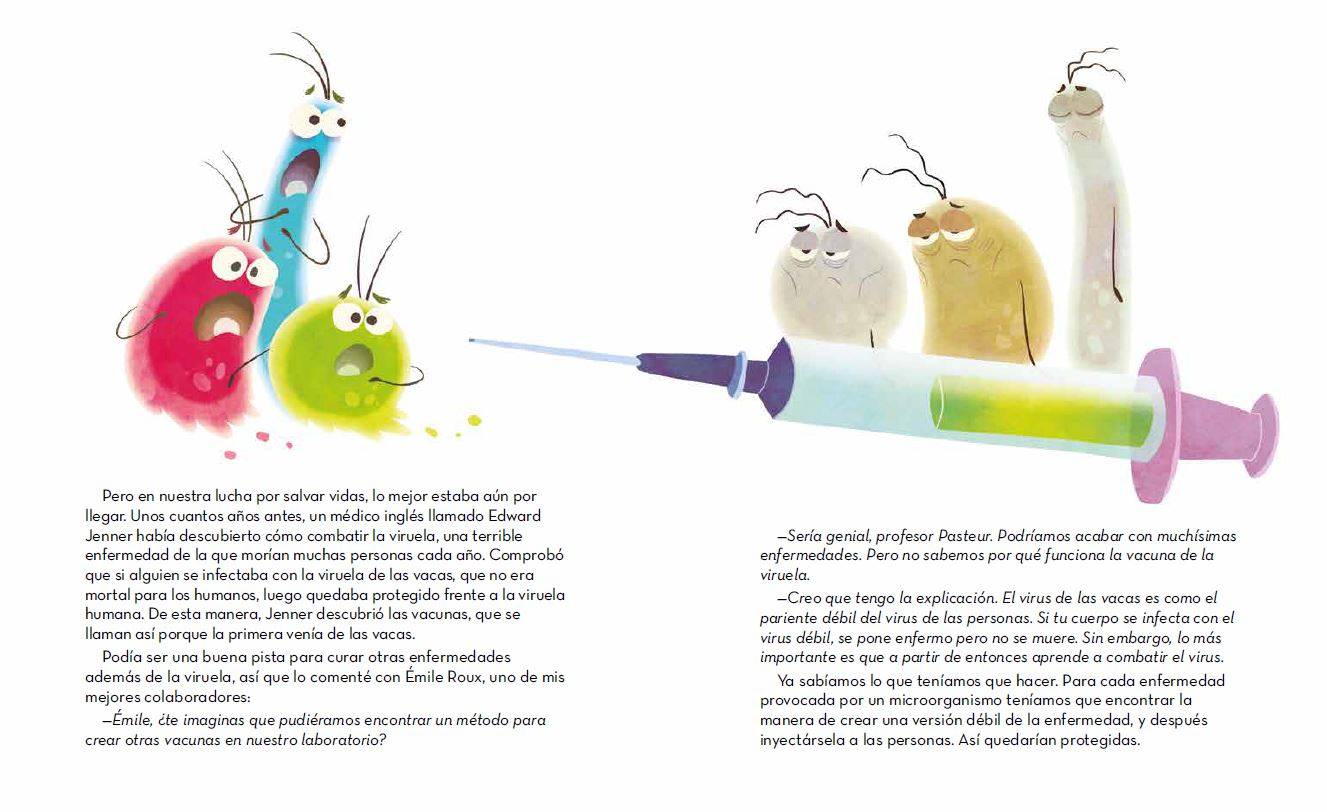 Aunque no puedas verlos, por todas partes hay muchísimos bichitos diminutos que pueden provocar que nos pongamos enfermos o que la comida se estropee: son los microbios. Louis Pasteur fue el primero en descubrirlos gracias a sus investigaciones con el microscopio. Además, halló la forma de prevenir muchas de las enfermedades con la invención de las vacunas. Pasteur dedicó toda su vida a la ciencia con el fin de ayudar a los demás, y gracias a sus hallazgos, millones de personas de todo el mundo han podido crecer sanas y fuertes sin peligro.