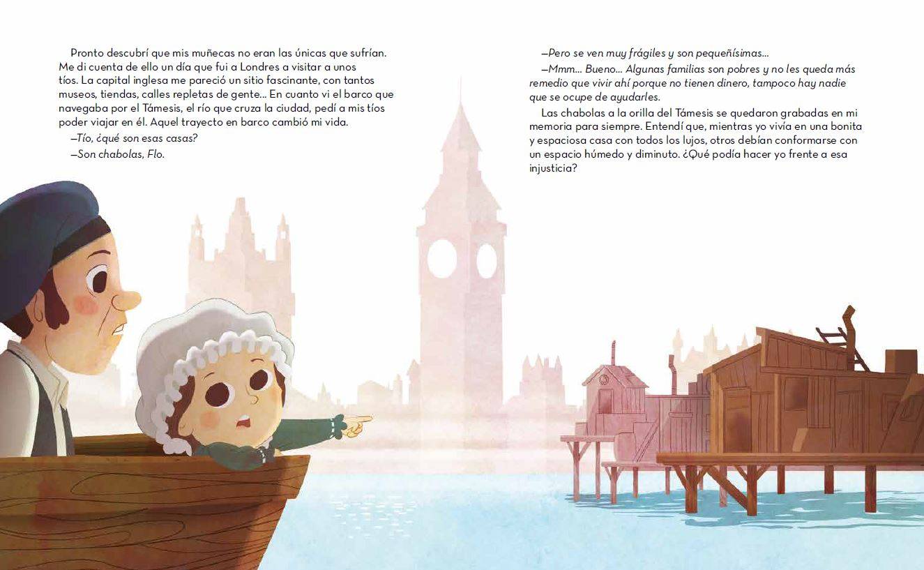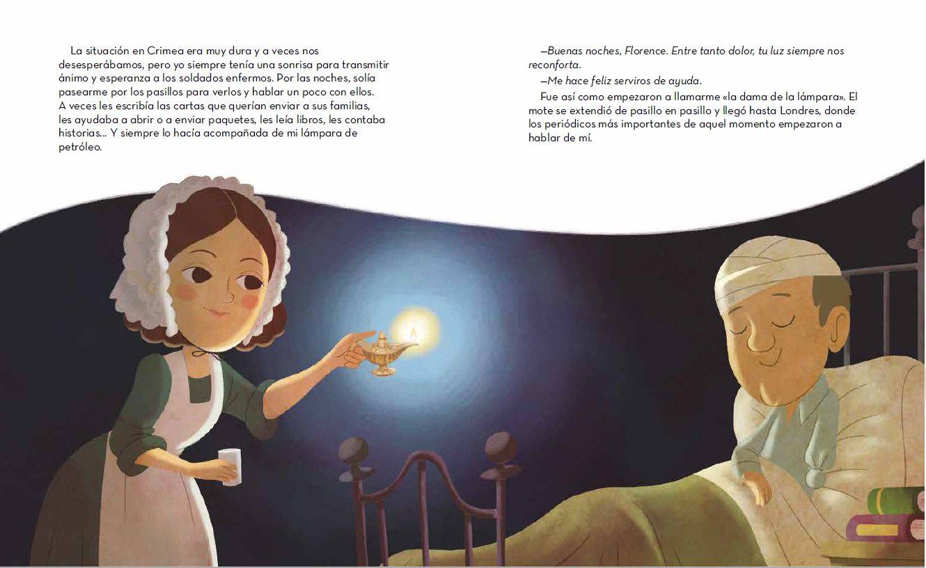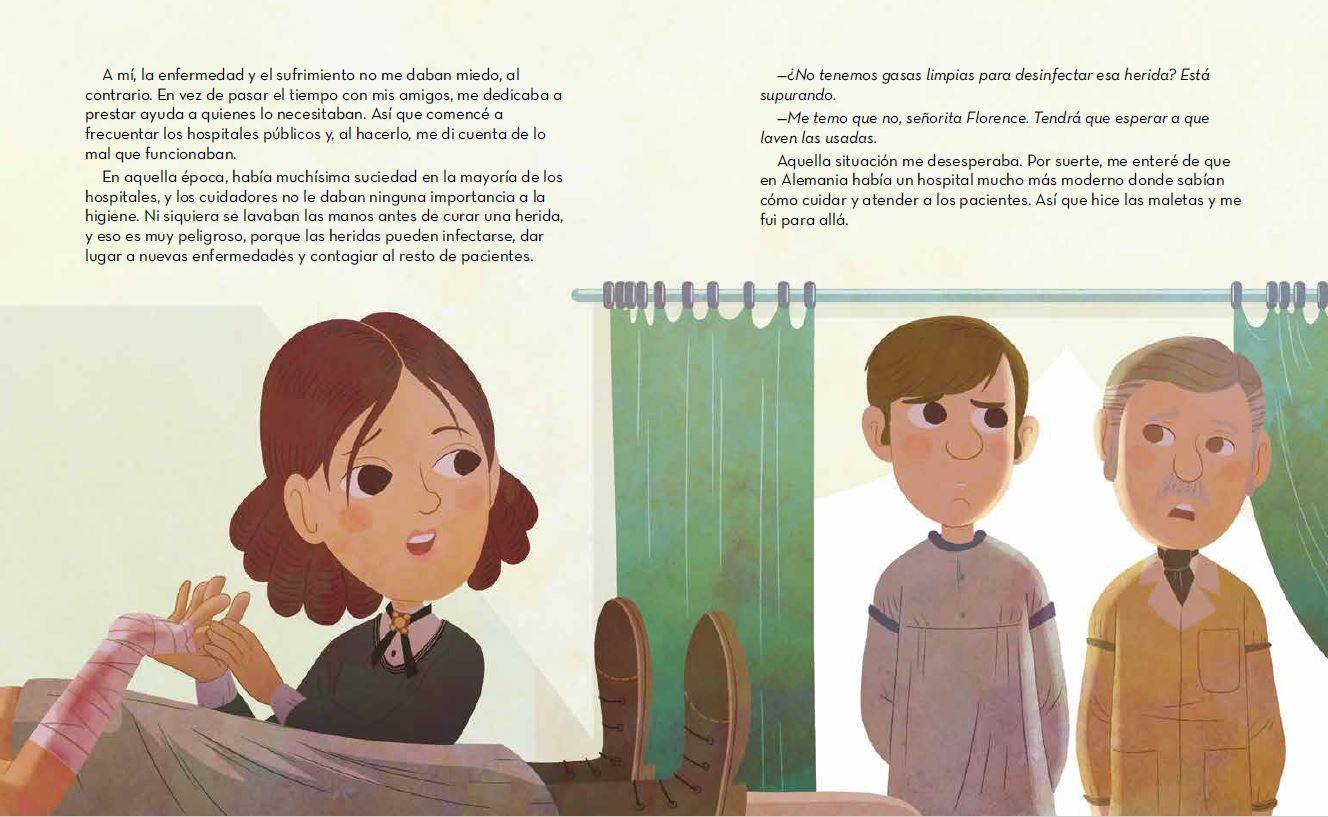 En la época en la que nació Florence Nightingale, los hospitales eran lugares sucios, donde trabajaban personas que no sabían casi nada de medicina ni de cómo tratar a los pacientes. Con esfuerzo y dedicación, Florence se convirtió en enfermera y se dio cuenta de que muchísimas enfermedades podían prevenirse si se mejoraban las condiciones higiénicas de los enfermos y de los centros sanitarios. Gracias a ese descubrimiento, salvó miles de vidas e inauguró la primera escuela de enfermería profesional del mundo.